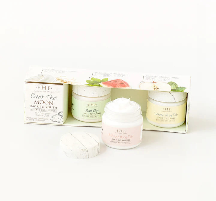 This 3-piece travel trio of whipped billowy softness is sure to please! Our Moon Dips® are not only addicting with a cloudlike-touch but also brimming with the dreamiest anti-aging ingredients – like vitamins A & E, advanced peptides & retinyl palmitate!