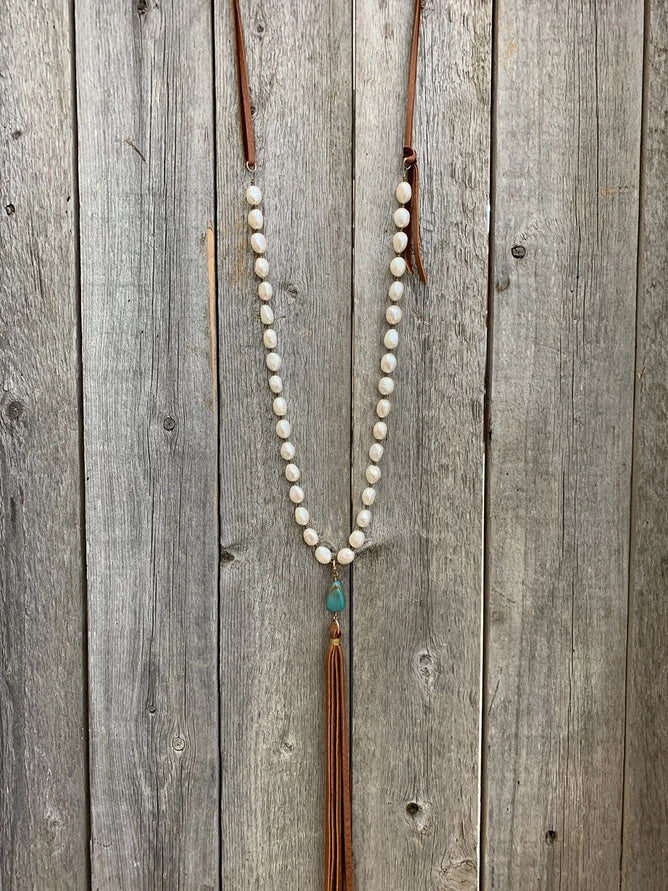 This is a 32” necklace comprised of freshwater pearls and leather back with a Kingman Turquoise and tassel drop. You can choose between four different leather colors: cognac, chocolate, saddle tan, and black.