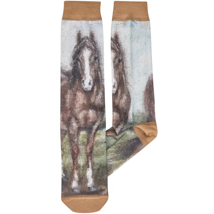 A pair of colorful knee-high socks from our Farmhouse Collection displaying a hand painted design of a brown horse on each sock. Design is digitally printed and replicated from original artwork painted onto burlap canvas, giving the art a unique depth and texture. Socks feature a knee-high length to easily show off the full design.