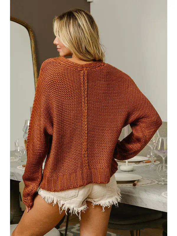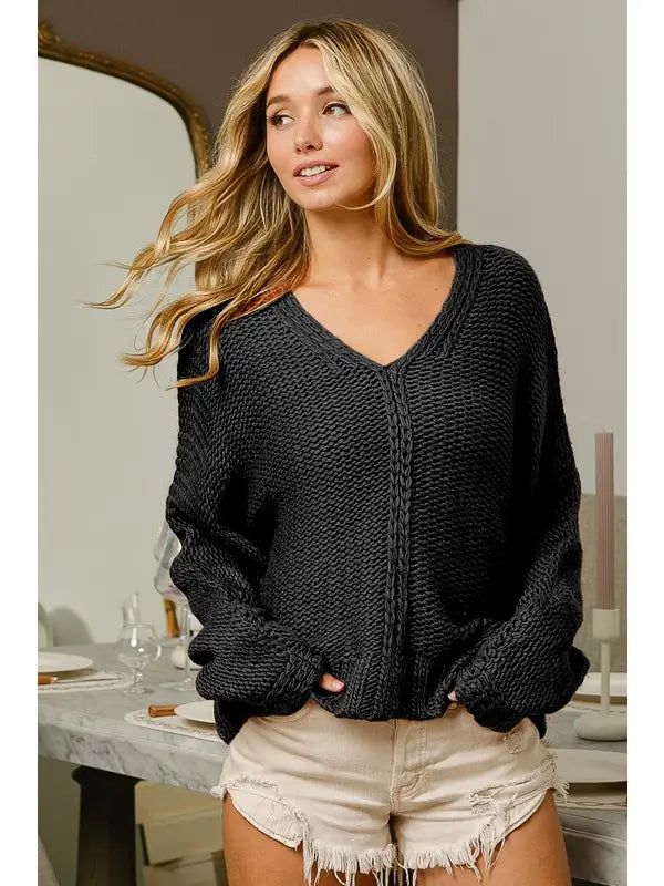 This relaxed-fit long sleeve sweater features a classic v-neckline and distinctive cable knit detailing running down the center front. The generous, slightly oversized silhouette provides comfortable layering and movement, while the pullover construction offers effortless styling. Crafted for versatility, it pairs seamlessly with everything from tailored trousers to casual denim. An essential wardrobe staple that balances timeless design with ease.