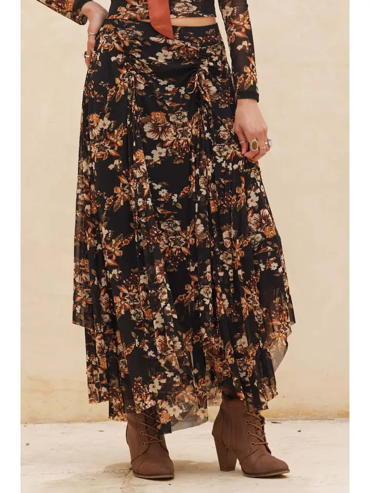 Edgy & a little Rebellious! Embrace bohemian-western style with this captivating floral-print mesh maxi skirt. The ruched front with a drawstring creates an intentional, artfully gathered look, while the handkerchief hem with raw edge delivers that effortlessly undone aesthetic. Built with an elastic waist for all-day comfort and partial lining for practicality, this ankle-length piece drapes in a relaxed silhouette that captures free-spirited elegance. Whether styled with boots or barefoot, it's a statement piece that embodies modern boho sensibility with western edge.