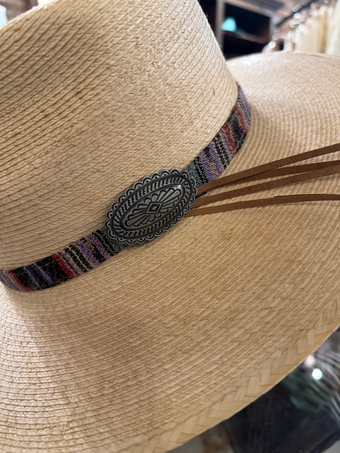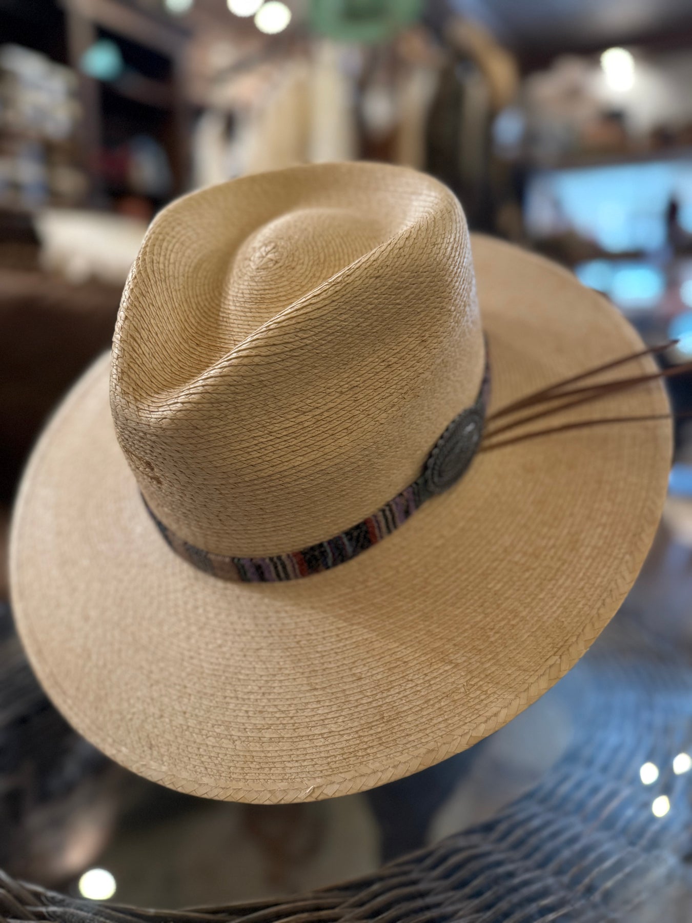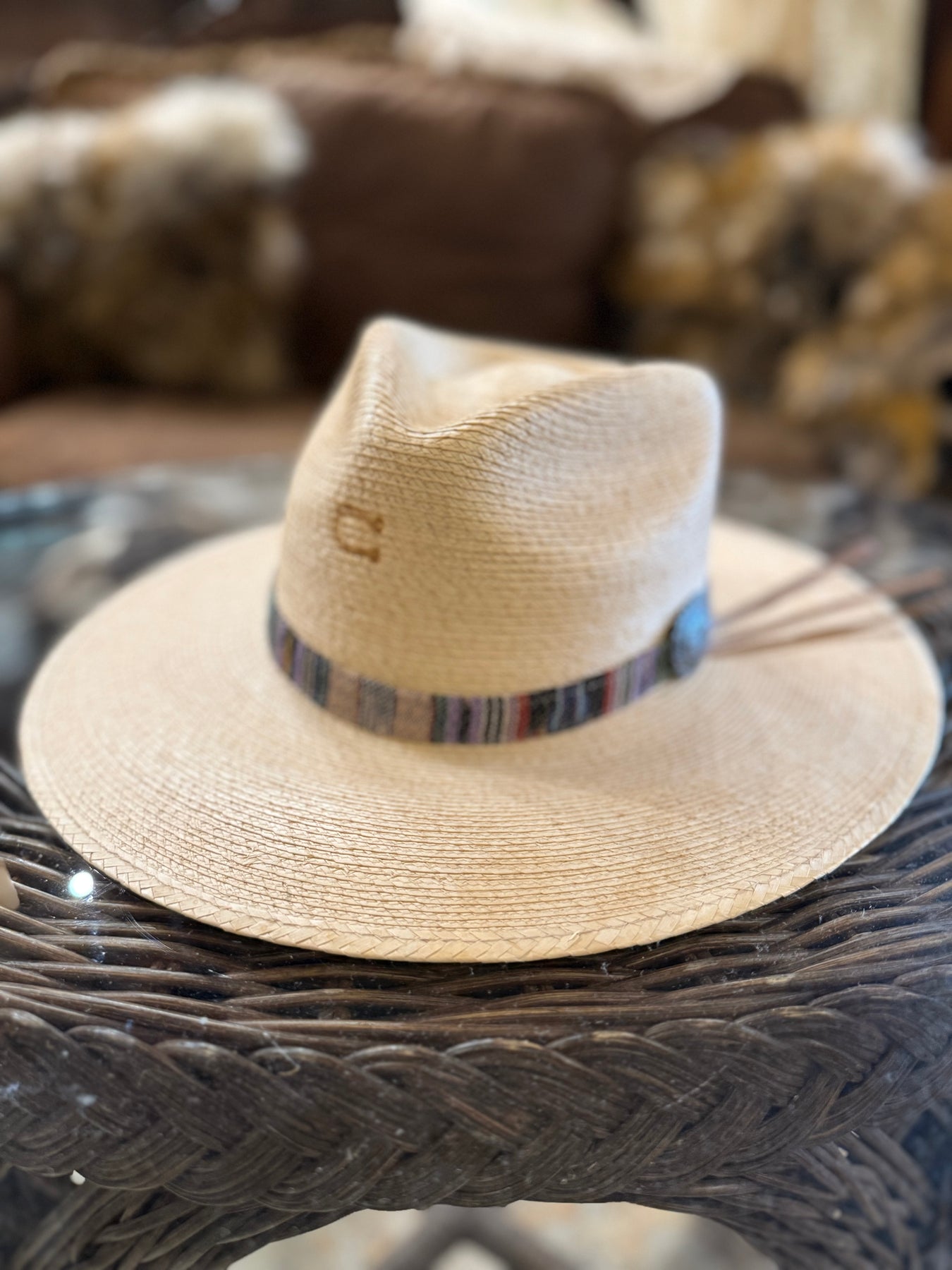 The Saltillo Palm Straw Fedora Hat, this genuine palm straw hat from Charlie 1 Horse is made in Mexico and features a multi-colored sarape hat band complete with metal concho accent. A stiff tear drop crown and supple snap brim give you a build that is durable and easy to manage. Fall in love with the breathability of an unlined, straw fedora hat!